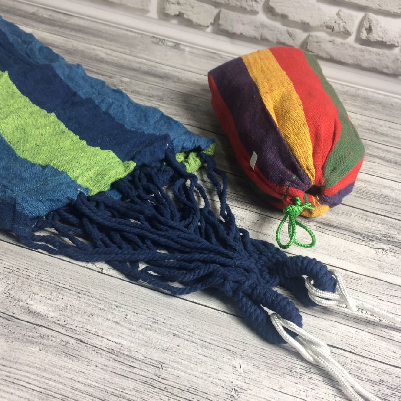 Гамак подарує Вам комфортний відпочинок на природі. Він виконаний з бавовни і здатний витримувати навантаження до 180 кілограм. Він легкий і компактний, поставляється в бавовняному мішечку-чохлі. Такий гамак можна взяти з собою в похід - в складеному вигляді він займає дуже мало місця.